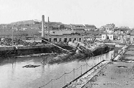 The Russian minelayer Amur sunk at Port Arthur as a result of bombardment by Japanese land based artillery during the siege of Port Arthur (December 1904).
